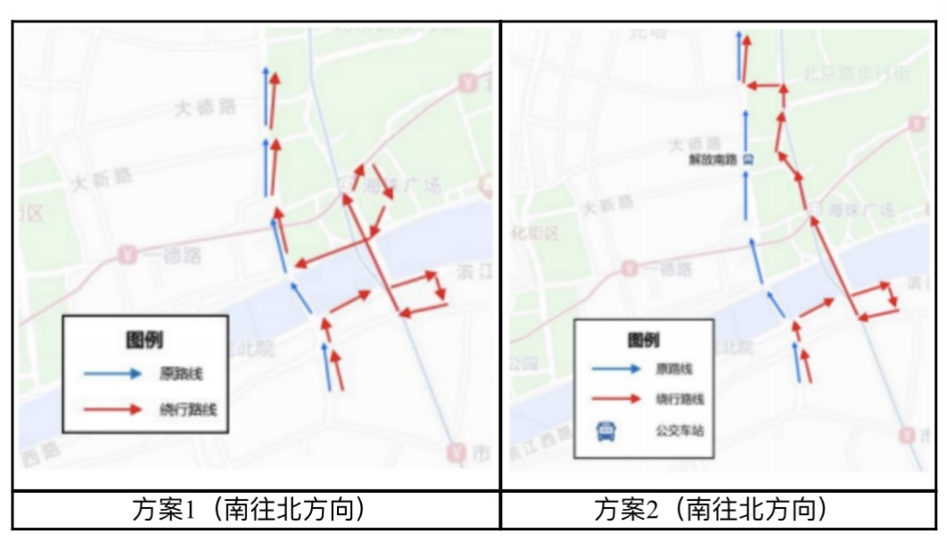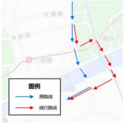 ②可通过同福东路→江南大道北→海珠桥→起义路→大南路回到既有路线,绕行500米,时间2分钟,但需取消北行方向解放南路公交站。