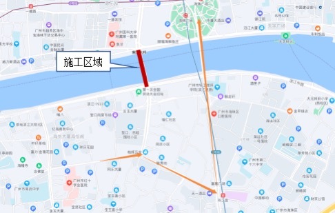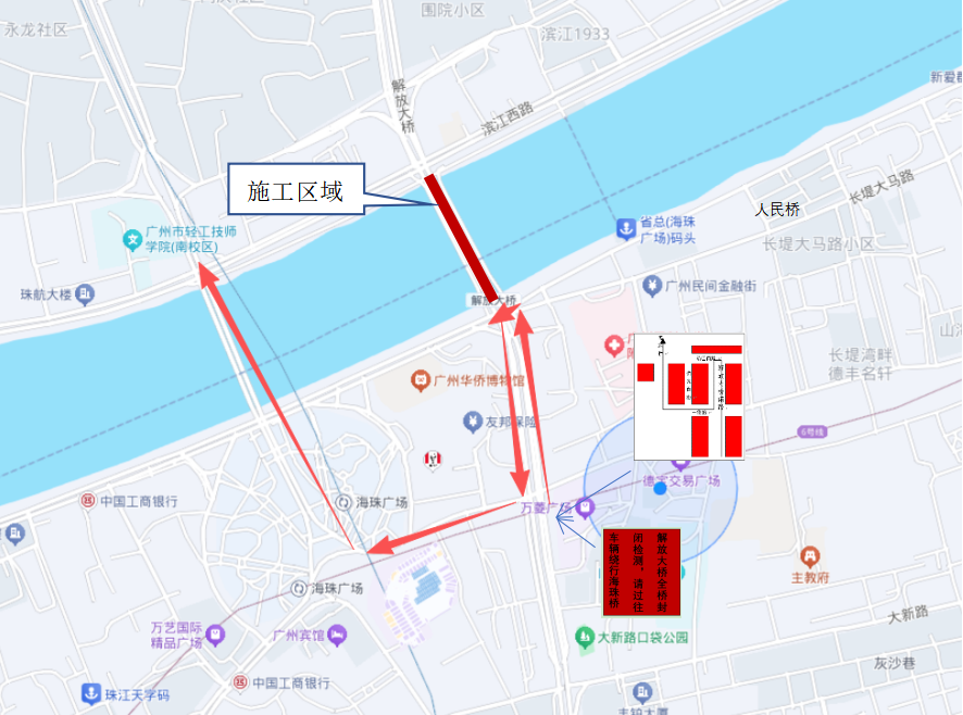 项目周边区域过江通道仅有解放大桥、海珠桥以及人民桥(洪德路)可通过行人及非机动车。解放大桥全封闭检测施工期间建议行人及非机动车绕行海珠桥。