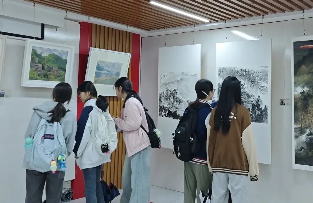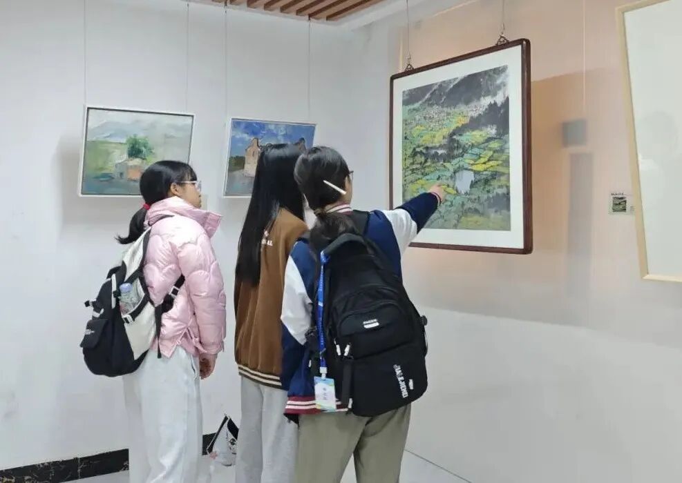 步入展厅,描绘杏花镇风光、人文与变迁的画作令人目不暇接。广美教授笔下的古朴沧桑、梯田光影,还有乡亲们的淳朴笑颜,让学生们直观感受到画笔表现真实生活的力量,纷纷惊叹乡村之美。
