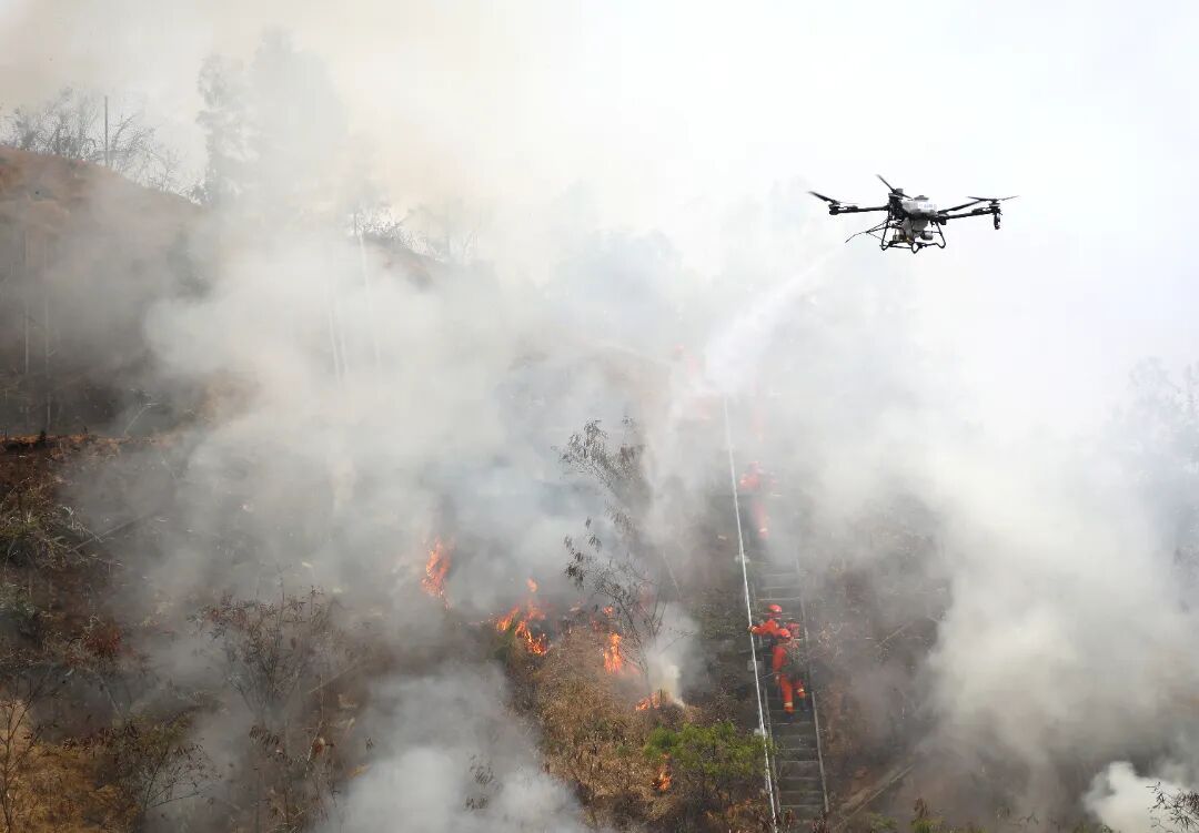由于模拟火场地形复杂、风力加大,地面扑救力量请求增援。演练随即进入“空地一体”协同作战的高潮阶段。