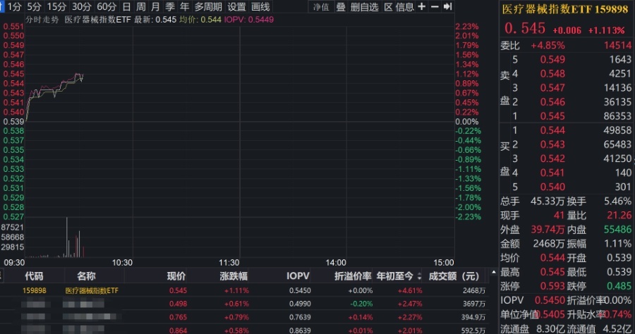12月18日,三大指数低开,大科技多板块回调,医疗器械、医药商业等方向逆势走强,中证全指医疗器械指数盘中上涨。相同标的ETF中年内涨幅居首的医疗器械指数ETF(159898)截至发稿上涨1.11%,据Wind数据显示魔术交流群,该ETF盘中获3800万份资金净申购。