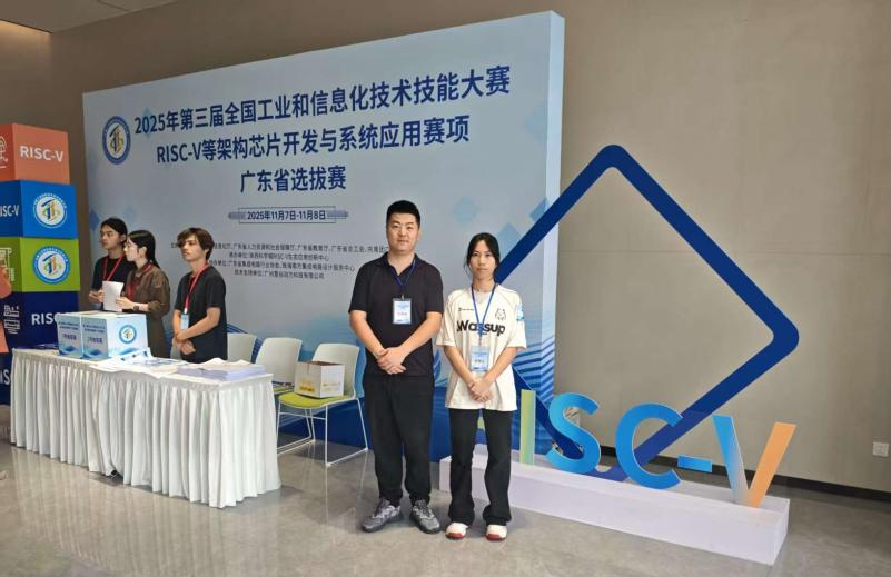 近日,第三届全国工业和信息化技术技能大赛“RISC-V等架构芯片开发与系统应用”赛项广东省选拔赛在珠海圆满落幕。由我校光电信息学院教师党支部书记刘振兴博士带队,物网241班蔡美婷、应电243班杨冬海首次参赛,与北京理工大学、深圳职业技术大学等本科院校队伍同台竞技,最终以第六名的成绩斩获学生组优胜奖,为学院在集成电路领域的技能赛事探索实现新突破。