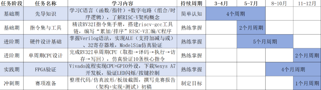 我校光电学子在此次大赛中获得第六名的好成绩,背后是一场为期六个月的“硬核攻坚”。刘振兴博士针对赛事“理论20%+实操80%”的考核特点,为学生量身打造了阶梯式精英训练体系:从基础期的C语言、RISC-V架构入门认知,到指令集工具链、Verilog硬件描述语言的熟练掌握,再到进阶期单周期CPU设计与仿真、FPGA板级验证的实操打磨,每个阶段都制定了明确的技能达标标准。