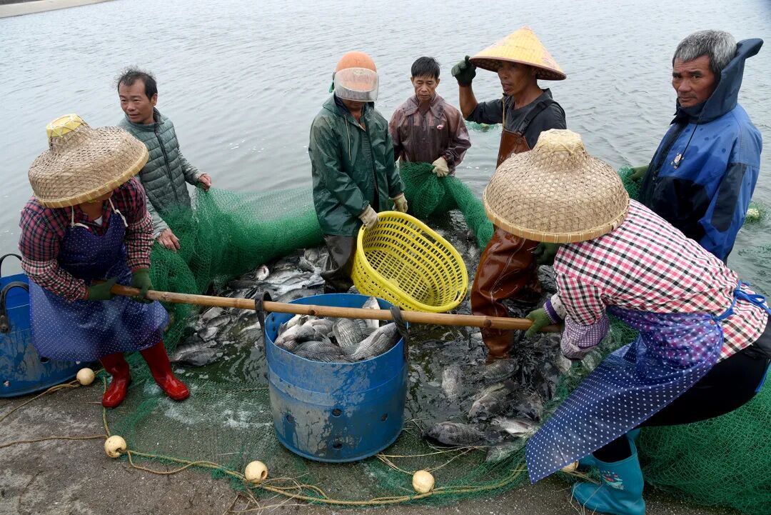 在滨海新区海洋牧场,金鲳鱼集中捕捞现场。吴昊 摄